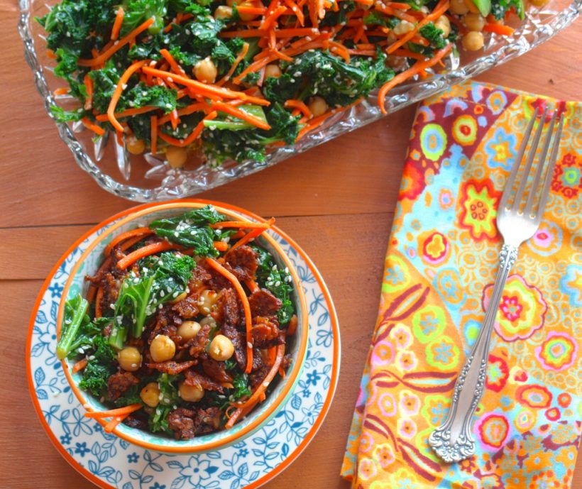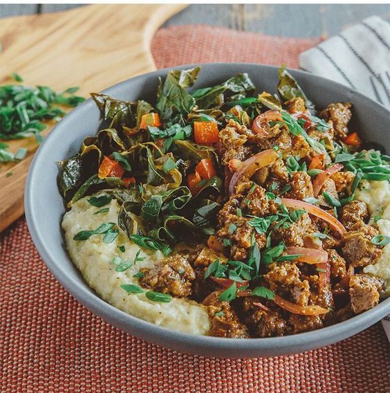 Made from wheat gluten, seitan’s meat-like qualities have deemed it a vegan staple. This recipe uses collard greens and garlicky-maple grits to create a southern-style experience on a platter. A total of 22 grams protein per serving included.
