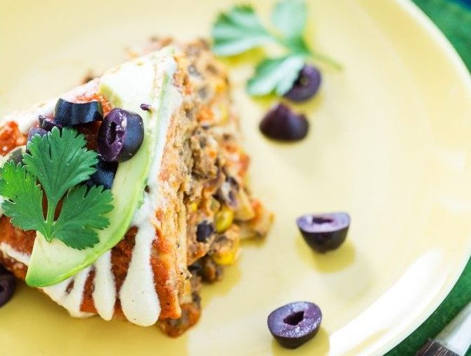 Made from mashed black beans, cashews, miso, and yeast, this “lazy-girl enchilada” has 20+ grams of protein per serving, and plenty of vitamins and minerals to amp your vegan nutritional needs. Fresh and zesty, this is tortilla creativity at its best.