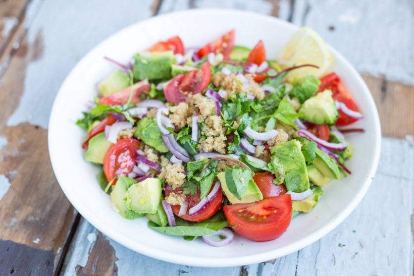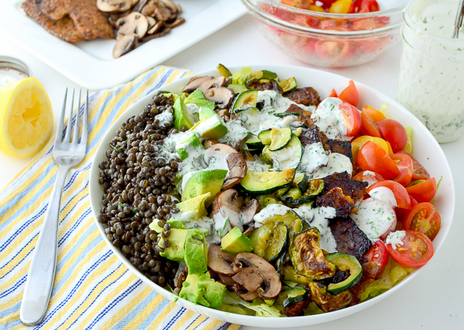 With 30 grams of protein from the tempeh and lentils alone, this hearty, skinny, vegan salad recipe can be easily prepped in containers, and mixed on the go. Made out of a dairy-free ranch dressing, it uses a variety of seasonal veggies for some serious health benefits.