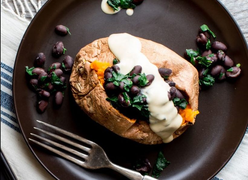 Easy to make with 21 grams of protein per serving, this sweet potato stuffed with black beans and kale, and topped with a hummus dressing made of chickpeas can become a loved dinner option in your vegan regime. Add a few spices to the dressing for an extra kick.