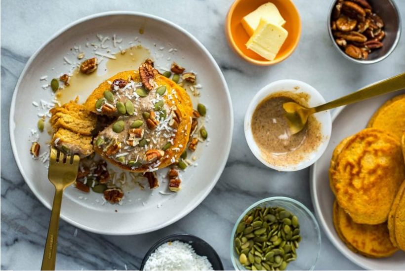 These freezer-ready pancakes have a total of 22 grams protein per serving. Topped with shredded coconut, chopped pecans, pumpkin, maple syrup and almond butter, these are quick and easy to make for hearty breakfasts or a snack.
