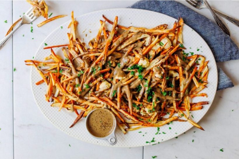 With 45 grams protein in the entire dish, this vegan poutine can be made from russet potatoes or sweet potatoes. Poutine is nothing but fries, but this one’s a baked and healthier version. It also includes mushrooms, almond milk, and vegan cheese.