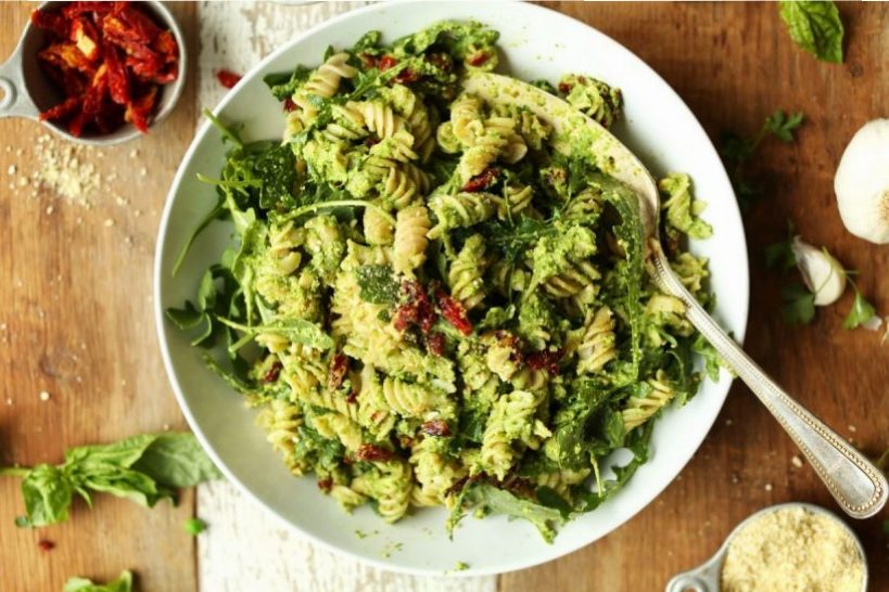 Peas are one of the top sources of vegan protein around. And this recipe totals 15.4 grams of protein in a small serving. Whipped up just in 30 minutes, its creamy and uses gluten-free fusilli made of quinoa and brown rice.
