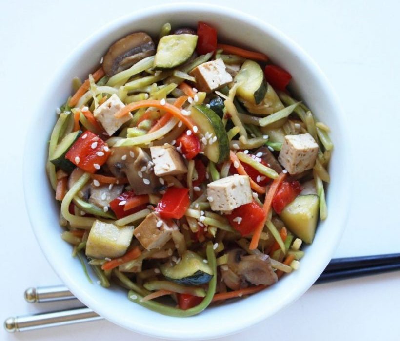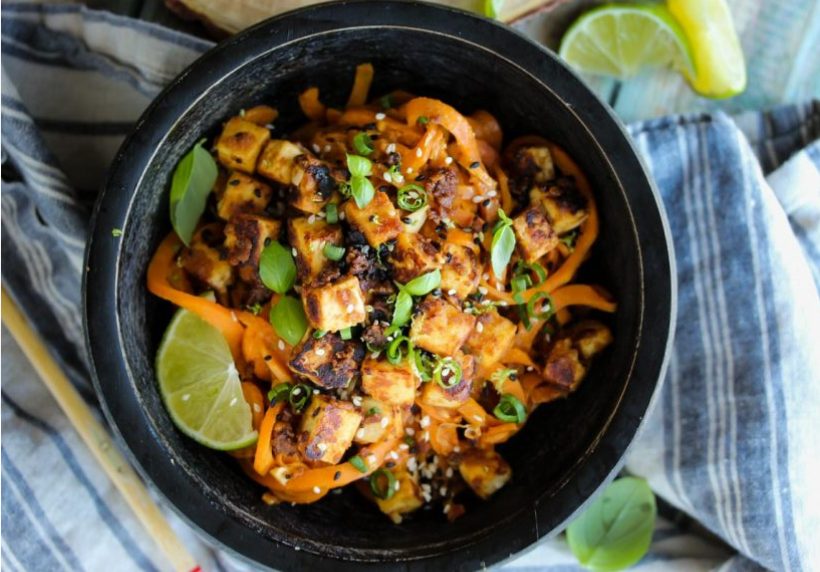 Noodles made out of this super root veggie, alongside crispy pan-seared tofu makes for one delicious combination. Packing in a total of 17 grams protein, this recipe is loaded with sticky, sweet sesame cashew sauce. Get that spiraliser out.