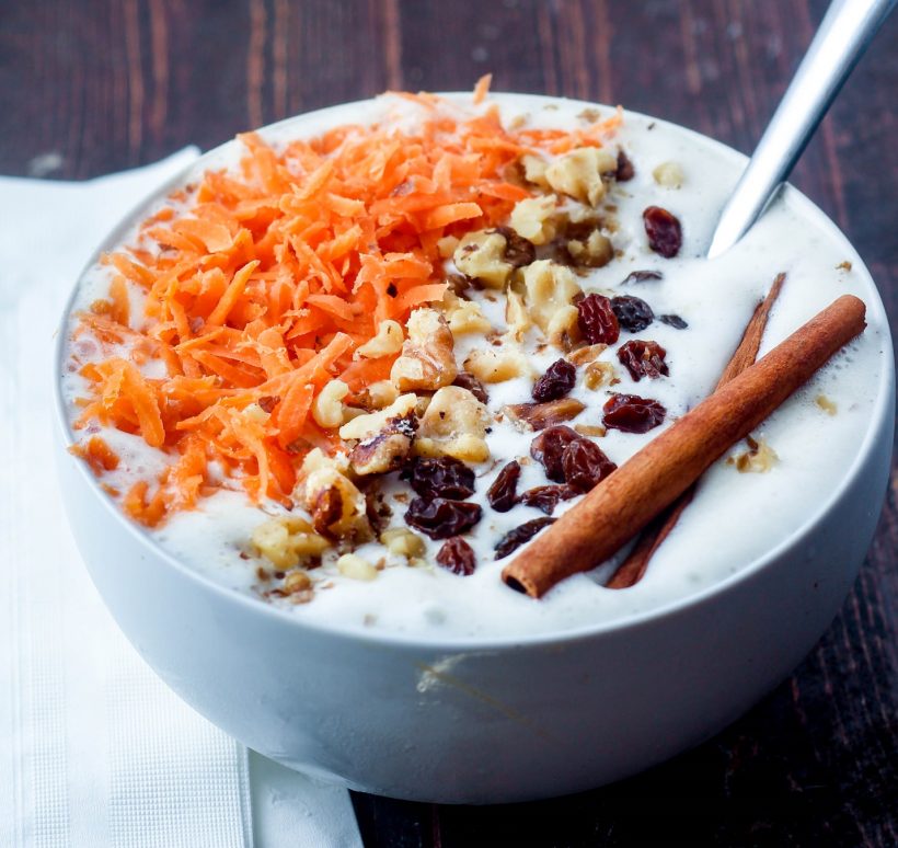 This high-protein gluten-free vegan breakfast recipe has all the goodness of carrots, dried fruits, and almond milk. Each serving has 20 grams of protein. You can experiment with different flavours of protein powder in this recipe.