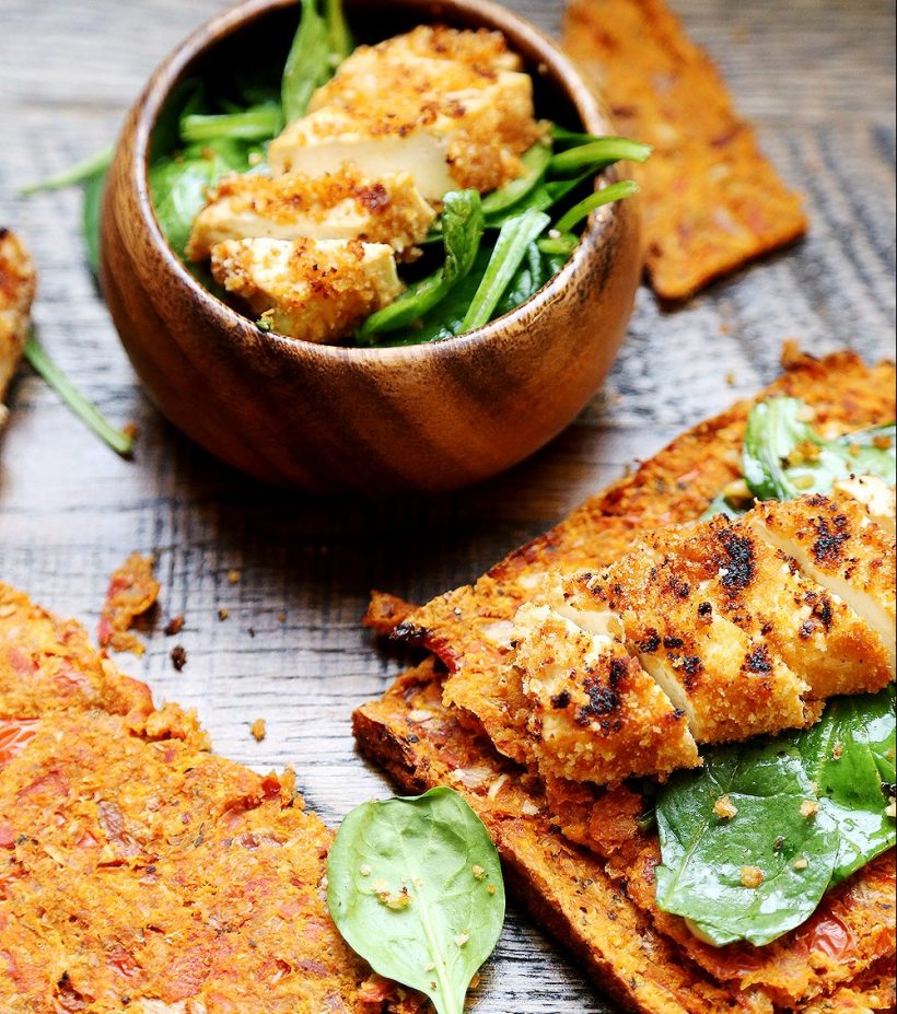 With 25 grams of protein per serving, this meal is completely worth spending the time on. Golden flaxseed meal ups the nutritional value of the recipe, while the healthy breaded tofu steaks themselves are quite delicious.