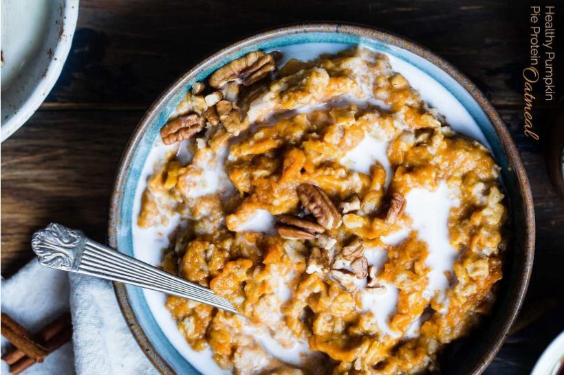 Filling enough to last you till lunch, this recipe uses vanilla almond milk and pumpkin puree to taste just like a pie. Packed with 14.5 grams protein per serving, this quick get-go recipe also hits the right macros to give you lasting energy.