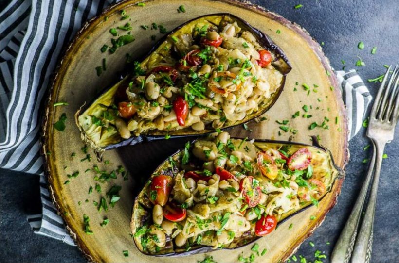 This Moroccan-inspired dish with veggies like white beans and tomatoes makes for a refreshing, healthy meal. Two of these plump, fleshy eggplant halves provide a total of 18.4 grams protein. The recipe also includes tips for a tex-mex profile.